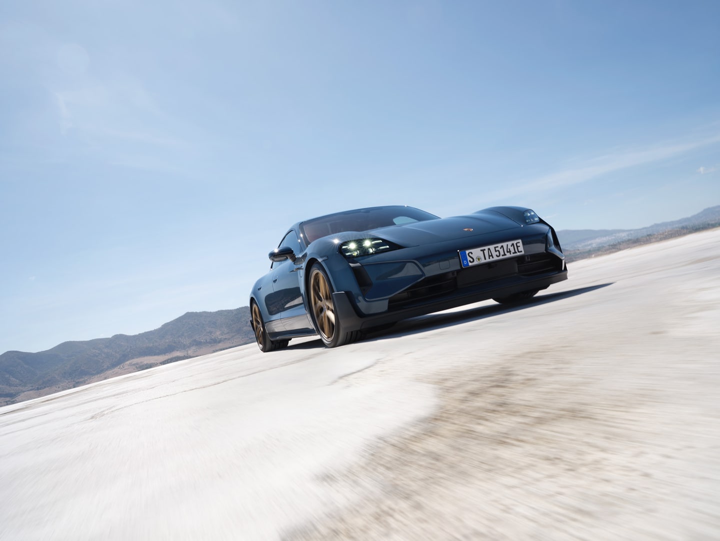- Taycan: A sporty, sloping profile, with black exterior side skirts and trim, 19-inch wheels, eight-way power-adjustable front comfort seats, and a modern cockpit. It delivers 402 horsepower to the rear wheels and features regenerative braking.